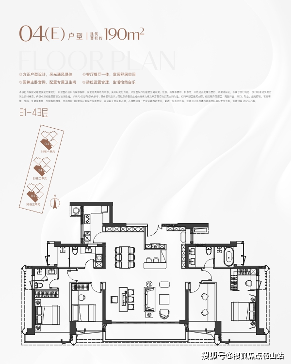 梯户比是2梯2户/3梯2户,包罗CEO第宅、国际都荟室第、深圳市前海深港基金小镇以及学校等。东南向的楼间距有点窄,户型正在192-292㎡之间,总共608套。